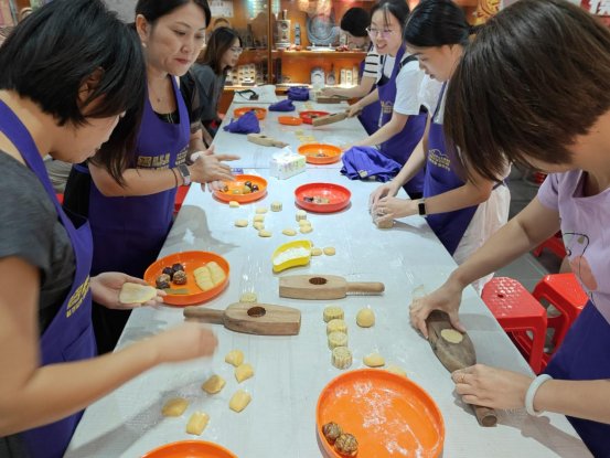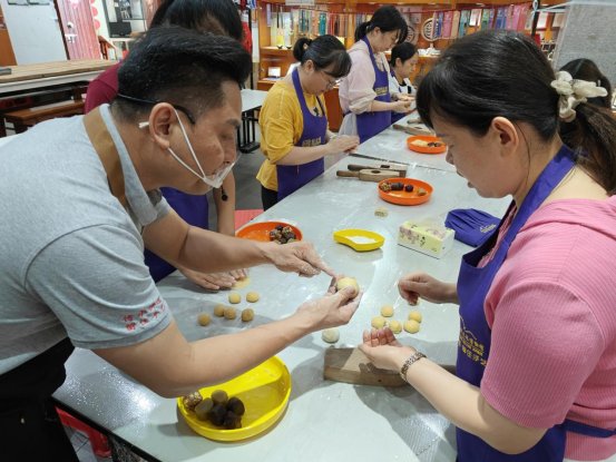 隨著專業(yè)烘焙老師的講解,月餅DIY制作環(huán)節(jié)正式開始。老師詳細演示了月餅制作的每一個步驟,從面團揉制的力度、餡料分配的比例,到模具按壓的技巧,并且及時為居民解答各種疑問。居民們熱情高漲,紛紛動手嘗試,不一會兒,一個個印著“中秋”“團圓”字樣的月餅雛形便呈現(xiàn)在眼前,現(xiàn)場充滿了歡聲笑語。
