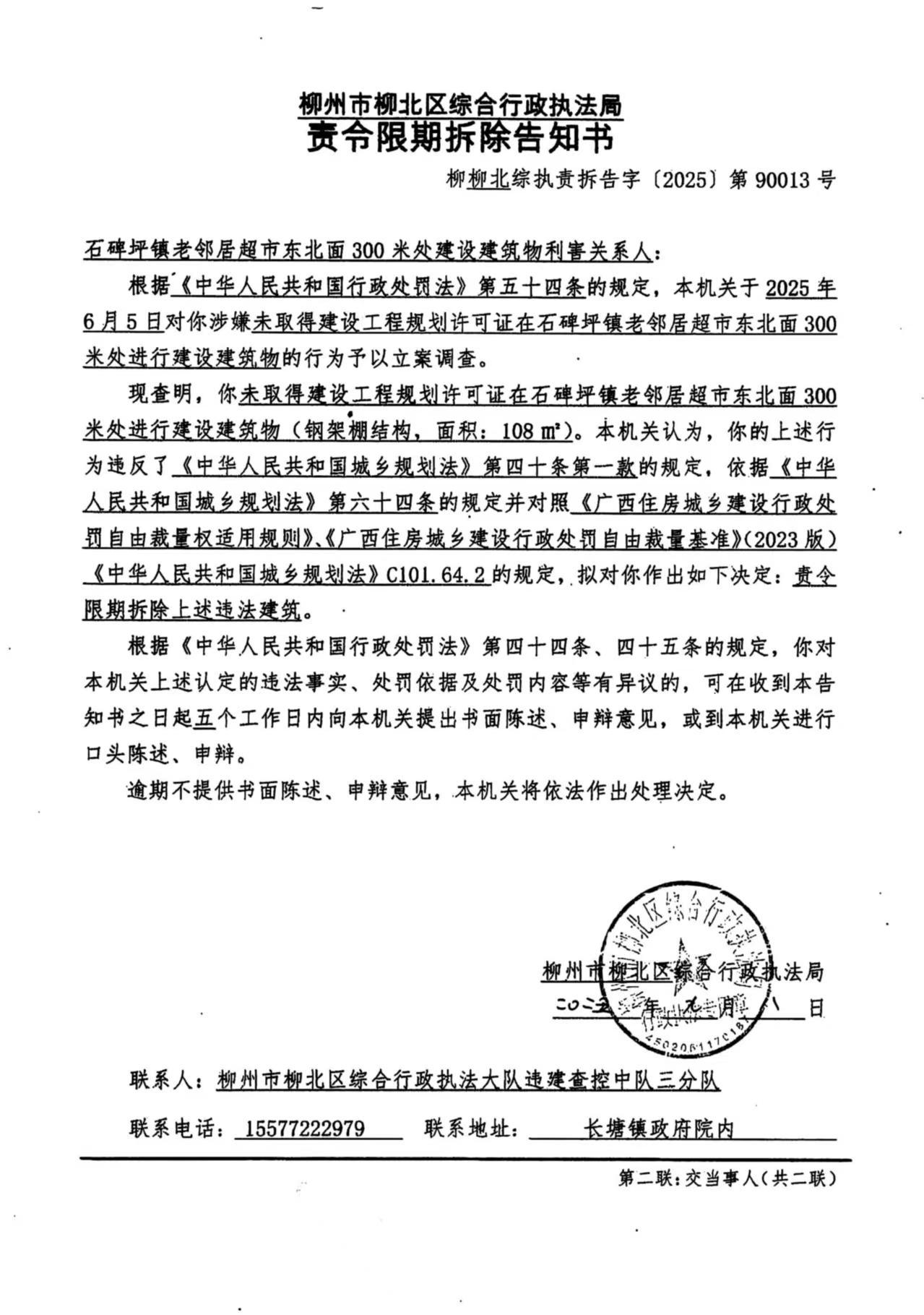 2025年9月8日,柳州市柳北區綜合行政執法局依法作出《責令限期拆除告知書》(柳柳北綜執責拆告字〔2025〕第90013號)。因利害關系人不詳無法采取其他方式送達,為確保當事人的合法權益,根據《中華人民共和國民事訴訟法》第九十五條第一款,《中華人民共和國行政處罰法》第六十一條第一款,《住房和城鄉建設行政處罰程序規定》第三十六條第二款之規定現向石碑坪鎮老鄰居超市東北面300米處建設建筑物利害關系人公告送達《責令限期拆除告知書》(柳柳北綜執責拆告字〔2025〕第90013號),公告期為三十日,公告期滿即視為送達。