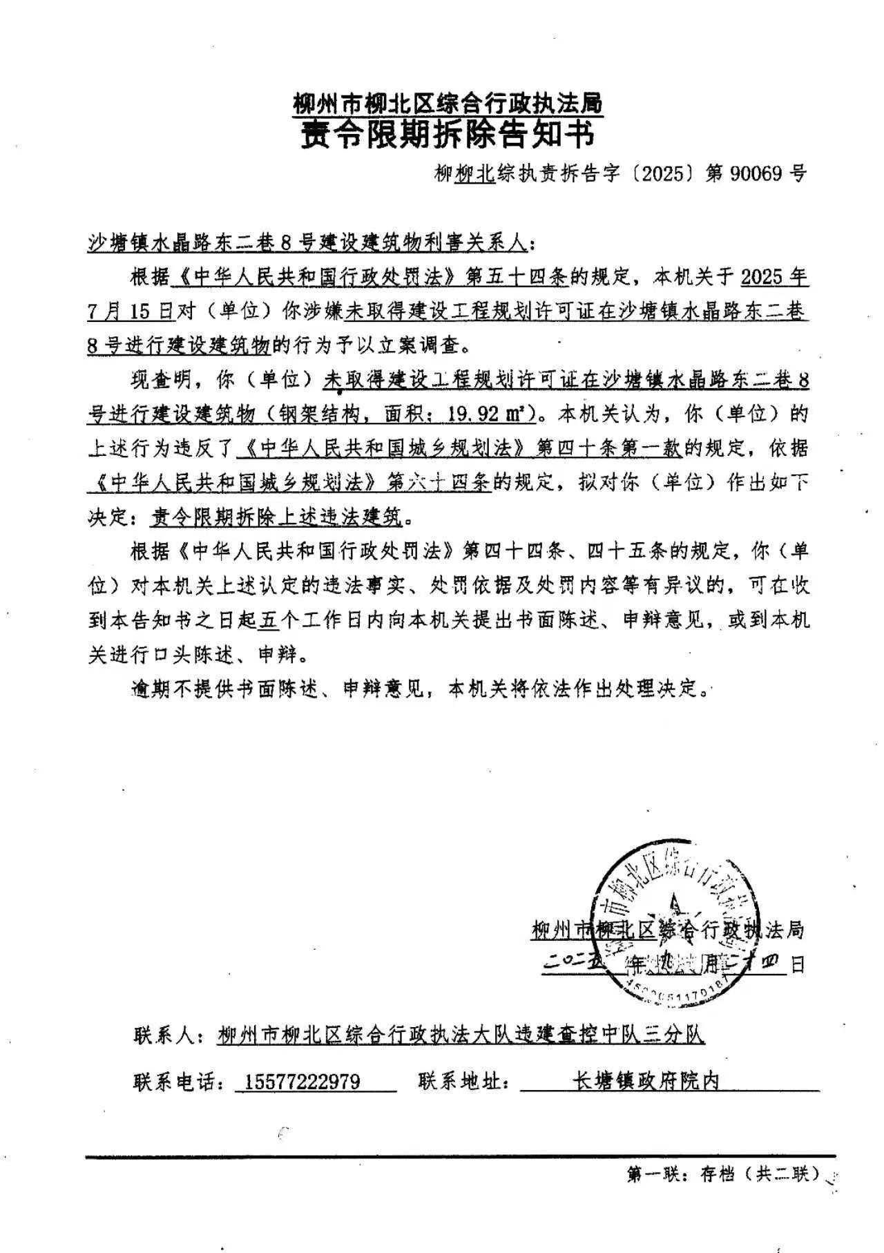 2025年9月24日,柳州市柳北區(qū)綜合行政執(zhí)法局依法作出《責(zé)令限期拆除告知書》(柳柳北綜執(zhí)責(zé)拆告字〔2025〕第90069號(hào))。因利害關(guān)系人不詳無法采取其他方式送達(dá),為確保當(dāng)事人的合法權(quán)益,根據(jù)《中華人民共和國民事訴訟法》第九十五條第一款,《中華人民共和國行政處罰法》第六十一條第一款,《住房和城鄉(xiāng)建設(shè)行政處罰程序規(guī)定》第三十六條第二款之規(guī)定現(xiàn)向沙塘鎮(zhèn)水晶路東二巷8號(hào)建設(shè)建筑物利害關(guān)系人公告送達(dá)《責(zé)令限期拆除告知書》(柳柳北綜執(zhí)責(zé)拆告字〔2025〕第90069號(hào)),公告期為三十日,公告期滿即視為送達(dá)。