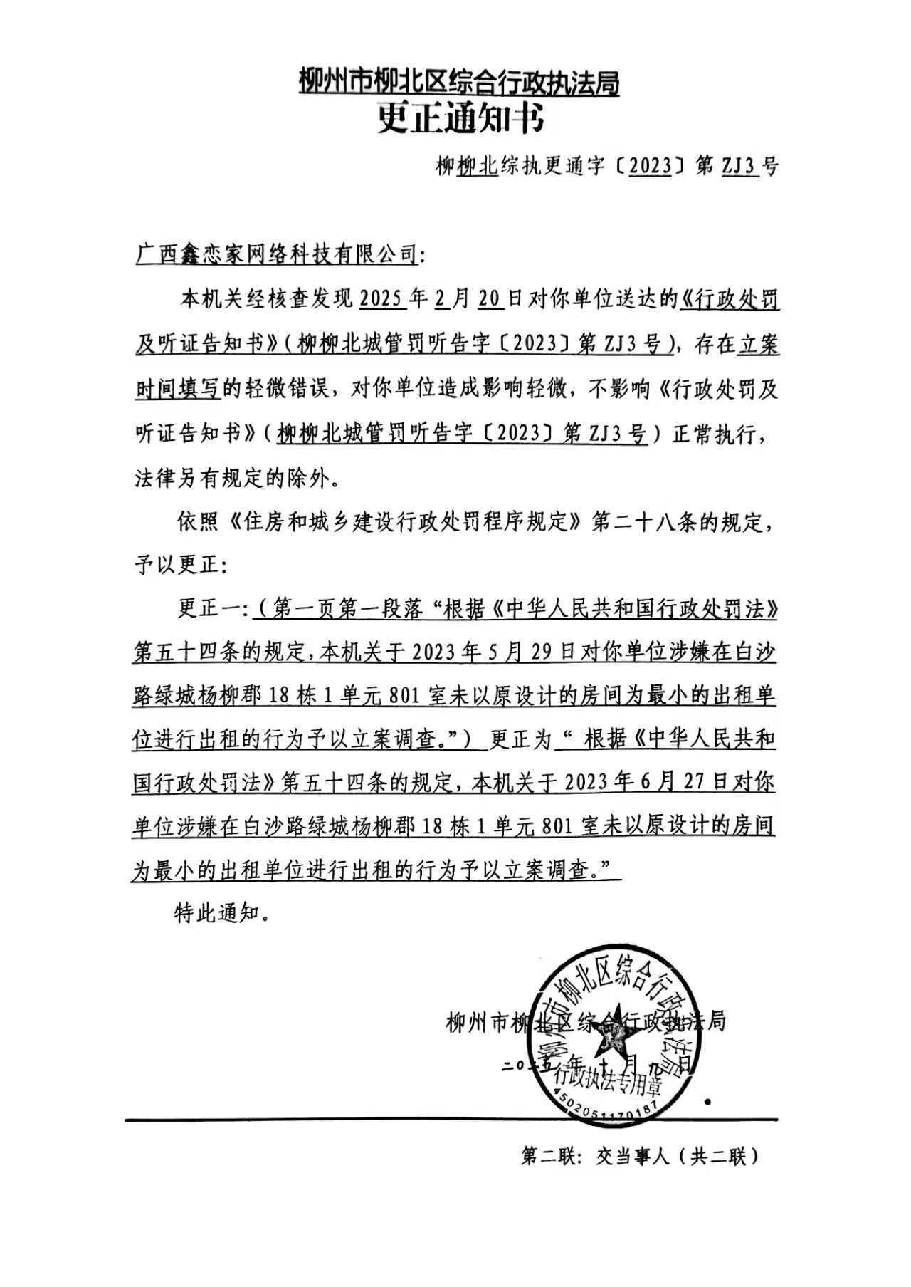 2025年10月9日,柳州市柳北區綜合行政執法局依法作出《更正通知書》(柳柳北綜執更通字〔2023〕第ZJ3號)。因當事人廣西鑫戀家網絡科技有限公司的經營地址已經撤銷且本機關聯系該公司法人姚積華嘗試進行郵寄送達或者電子送達時,該公司法人姚積華采取提供無效地址、刻意回避以及拒接電話等形式躲避送達,導致本機關無法以直接送達、留置送達、郵寄送達等方式向當事人廣西鑫戀家網絡科技有限公司進行送達。為確保當事人的合法權益,根據《中華人民共和國民事訴訟法》第九十五條第一款,《中華人民共和國行政處罰法》第六十一條第一款,《住房和城鄉建設行政處罰程序規定》第三十六條第二款之規定向廣西鑫戀家網絡科技有限公司公告送達《更正通知書》(柳柳北綜執更通字〔2023〕第ZJ3號),請廣西鑫戀家網絡科技有限公司自本公告發布之日起30日內,前往本機關領取上述文書,逾期則視為送達。