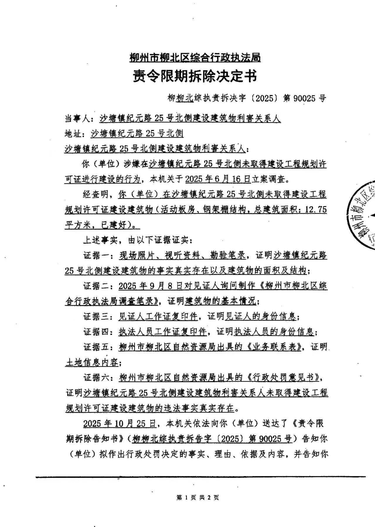 2025年10月31日,柳州市柳北區(qū)綜合行政執(zhí)法局依法作出《責令限期拆除決定書》(柳柳北綜執(zhí)責拆決字〔2025〕第90025號)。因利害關(guān)系人不詳無法采取其他方式送達,為確保當事人的合法權(quán)益,根據(jù)《中華人民共和國民事訴訟法》第九十五條第一款,《中華人民共和國行政處罰法》第六十一條第一款,《住房和城鄉(xiāng)建設(shè)行政處罰程序規(guī)定》第三十六條第二款之規(guī)定現(xiàn)向沙塘鎮(zhèn)紀元路25號北側(cè)建設(shè)建筑物利害關(guān)系人公告送達《責令限期拆除決定書》(柳柳北綜執(zhí)責拆決字〔2025〕第90025號),公告期為三十日,公告期滿即視為送達。