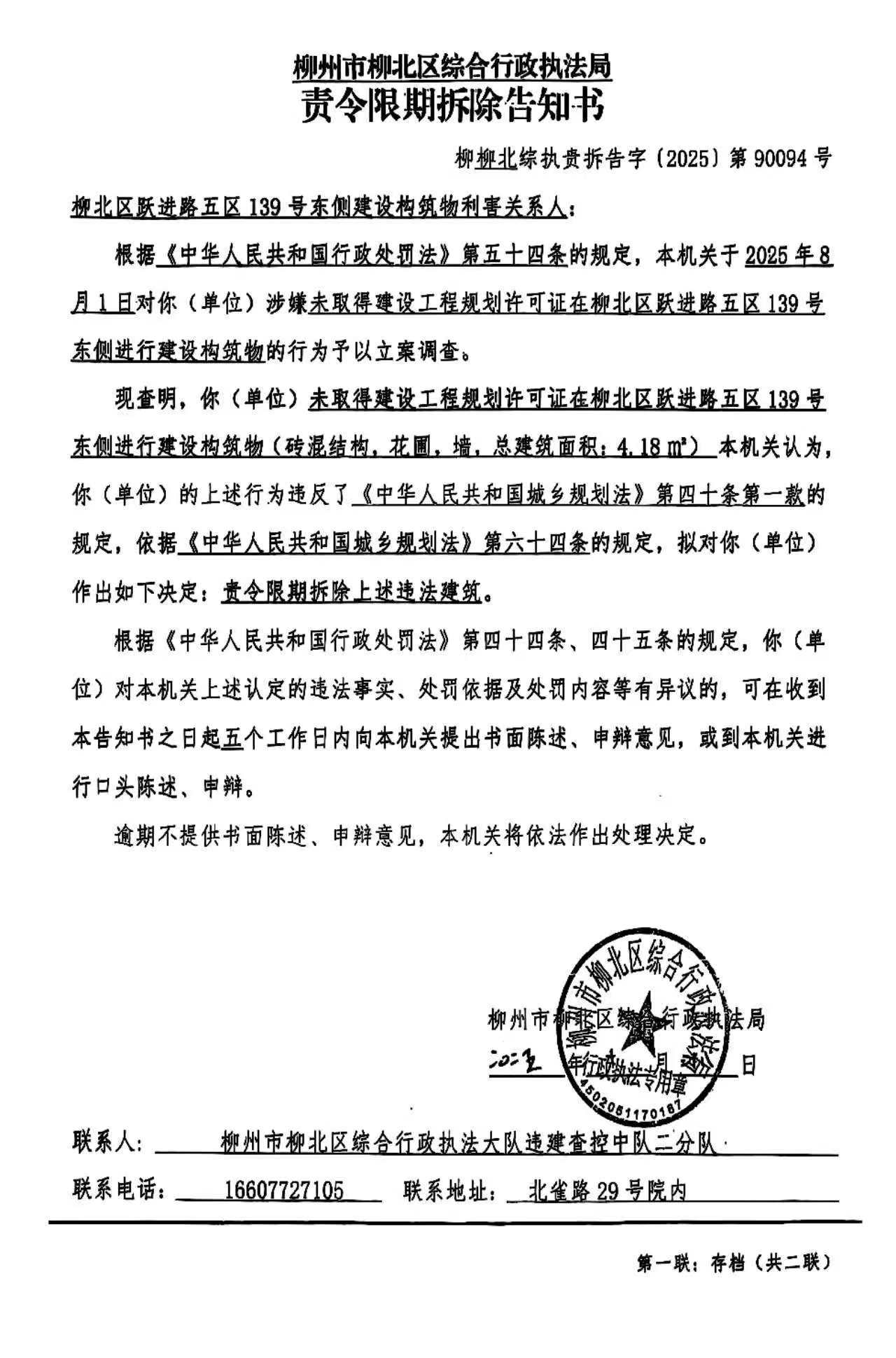2025年10月28日,柳州市柳北區綜合行政執法局依法作出《責令限期拆除告知書》(柳柳北綜執責拆告字〔2025〕第90094號)。因利害關系人不詳無法采取其他方式送達,為確保利害關系人的合法權益,根據《中華人民共和國民事訴訟法》第九十五條第一款,《中華人民共和國行政處罰法》第六十一條第一款,《住房和城鄉建設行政處罰程序規定》第三十六條第二款之規定向柳北區躍進路五區139號東側建設構筑物利害關系人公告送達《責令限期拆除告知書》(柳柳北綜執責拆告字〔2025〕第90094號),公告期為三十日,公告期滿即視為送達。