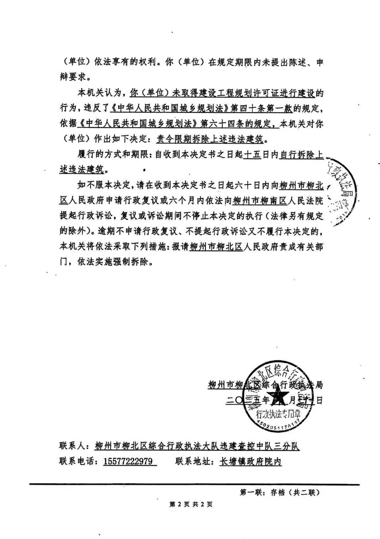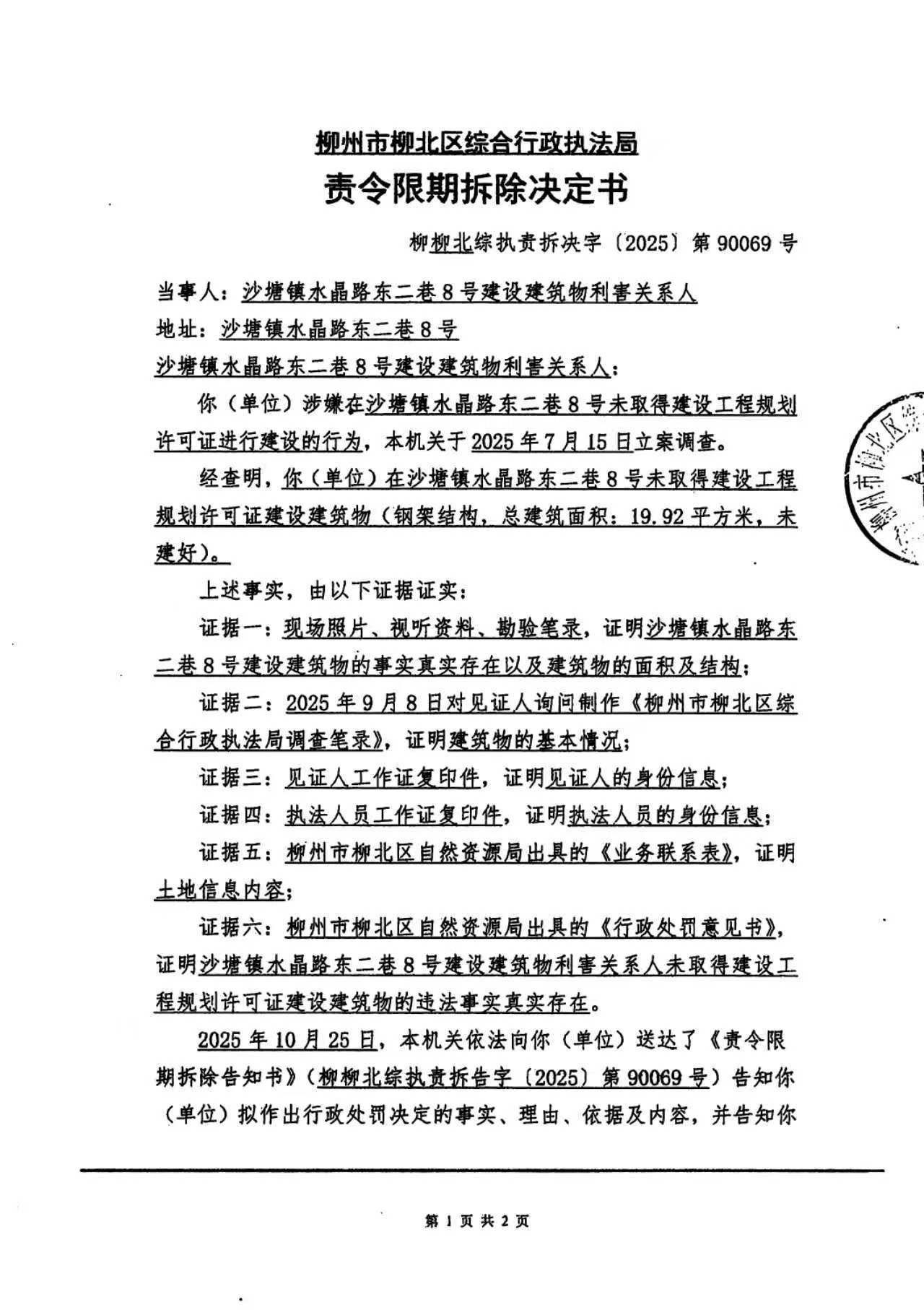 2025年10月31日,柳州市柳北區(qū)綜合行政執(zhí)法局依法作出《責(zé)令限期拆除決定書(shū)》(柳柳北綜執(zhí)責(zé)拆決字〔2025〕第90069號(hào))。因利害關(guān)系人不詳無(wú)法采取其他方式送達(dá),為確保當(dāng)事人的合法權(quán)益,根據(jù)《中華人民共和國(guó)民事訴訟法》第九十五條第一款,《中華人民共和國(guó)行政處罰法》第六十一條第一款,《住房和城鄉(xiāng)建設(shè)行政處罰程序規(guī)定》第三十六條第二款之規(guī)定現(xiàn)向沙塘鎮(zhèn)水晶路東二巷8號(hào)建設(shè)建筑物利害關(guān)系人公告送達(dá)《責(zé)令限期拆除決定書(shū)》(柳柳北綜執(zhí)責(zé)拆決字〔2025〕第90069號(hào)),公告期為三十日,公告期滿即視為送達(dá)。