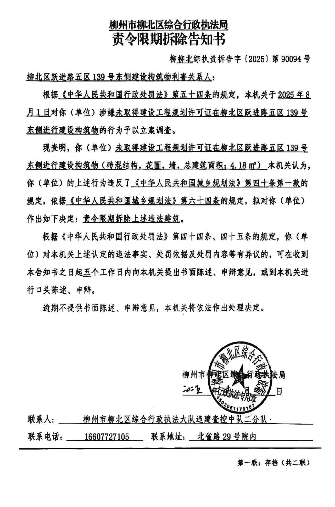2025年10月28日,柳州市柳北區(qū)綜合行政執(zhí)法局依法作出《責(zé)令限期拆除告知書》(柳柳北綜執(zhí)責(zé)拆告字〔2025〕第90094號(hào))。因利害關(guān)系人不詳無法采取其他方式送達(dá),為確保利害關(guān)系人的合法權(quán)益,根據(jù)《中華人民共和國民事訴訟法》第九十五條第一款,《中華人民共和國行政處罰法》第六十一條第一款,《住房和城鄉(xiāng)建設(shè)行政處罰程序規(guī)定》第三十六條第二款之規(guī)定向柳北區(qū)躍進(jìn)路五區(qū)139號(hào)東側(cè)建設(shè)構(gòu)筑物利害關(guān)系人公告送達(dá)《責(zé)令限期拆除告知書》(柳柳北綜執(zhí)責(zé)拆告字〔2025〕第90094號(hào)),公告期為三十日,公告期滿即視為送達(dá)。